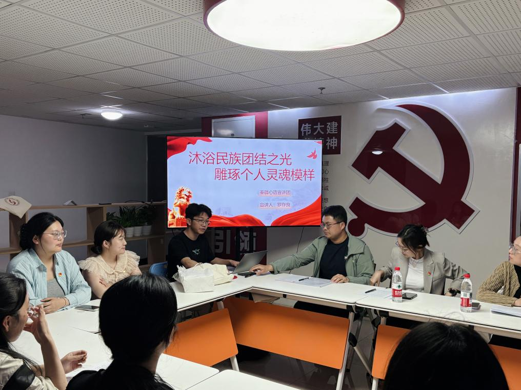 第三个环节:微党课宣讲。研究生党员李萌培同志进行了《石榴花开共奋进 籽籽同心绘新卷》微党课主题宣讲,生动地讲述了在铸牢中华民族共同体意识中新时代青年的责任与使命,演讲激发了同学们的爱国热情和奋斗精神。