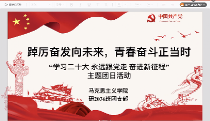 11月14日上午,williamhill中文官网研2036班团支部以“踔厉奋发向未来,青春奋斗正当时”为主题,开展了线上主题团日活动。本次活动旨在加深青年团员对党的二十大精神的学习和领会,活动由团支书王一涵主持。