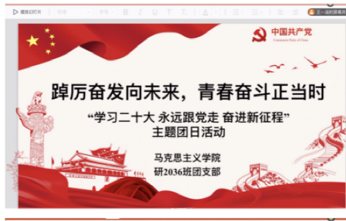 研2036班团支部围绕党的二十大报告中关于“中国式现代化”相关内容展开学习,支部成员积极交流心得感悟。大家深刻地认识到,只有大力发扬理论联系实际的马克思主义优良学风,持之以恒地往实里走深里走,党的二十大精神才能真正落地生根,开花结果。