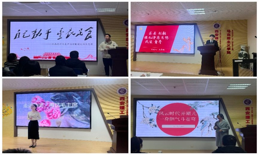 比赛伊始,由主持人介绍参加本次比赛的评委嘉宾及相关人员,并宣读比赛细则。随后演讲赛正式开始,各代表队根据抽签顺序分别登台演讲,主题紧扣毛泽东思想深刻内涵以及当代启示,结合《毛泽东思想和中国特色社会主义理论体系概论》课程,从政治、经济、军事、文化、历史等多角度表达了对毛泽东同志的缅怀和对毛泽东思想的深刻体会。“敢叫日月换新天”的革命目标、“为有牺牲多壮志”的革命精神、“人间正道是沧桑”“雄关漫漫真如铁”的革命历程,话里行间都体现着青年人的家国情怀、崇高理想和奋斗志向,整个会场洋溢着青春活力的昂扬气息。