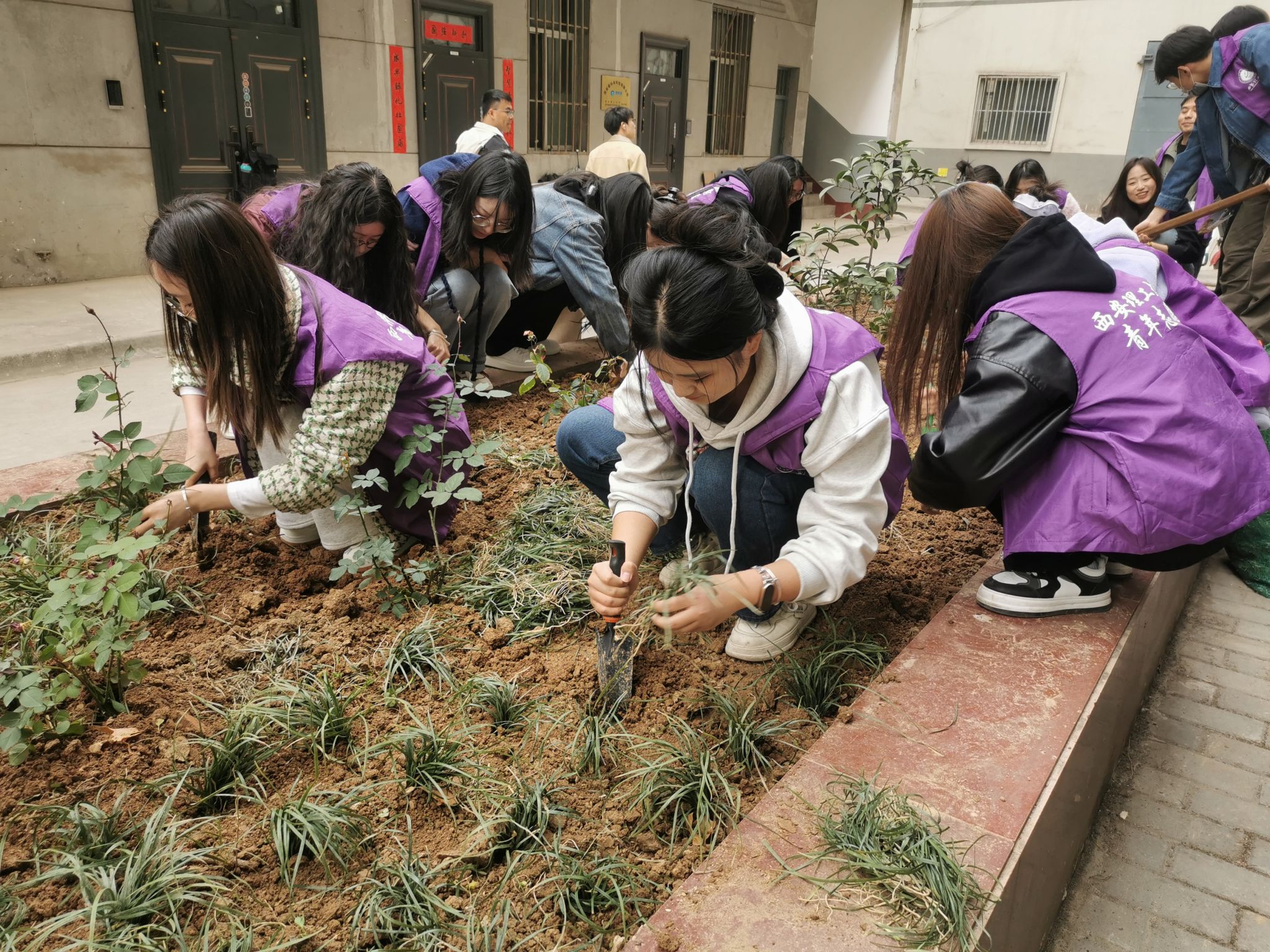 种完月季花,孙老师带领同学们来到另一个花坛种植麦冬草。孙老师向同学们详细介绍了麦冬草这一兼具观赏价值和药用价值的植物特点,它耐得住恶劣环境、适应能力很强,在保持水土、涵养水源方面发挥了重要的作用。有了之前种植月季的经验后,同学们挖坑、浇水更加得心应手,分区域完成种植任务,大家表示,未来要学习麦冬草无私奉献的品格,将雷锋精神代代相传。