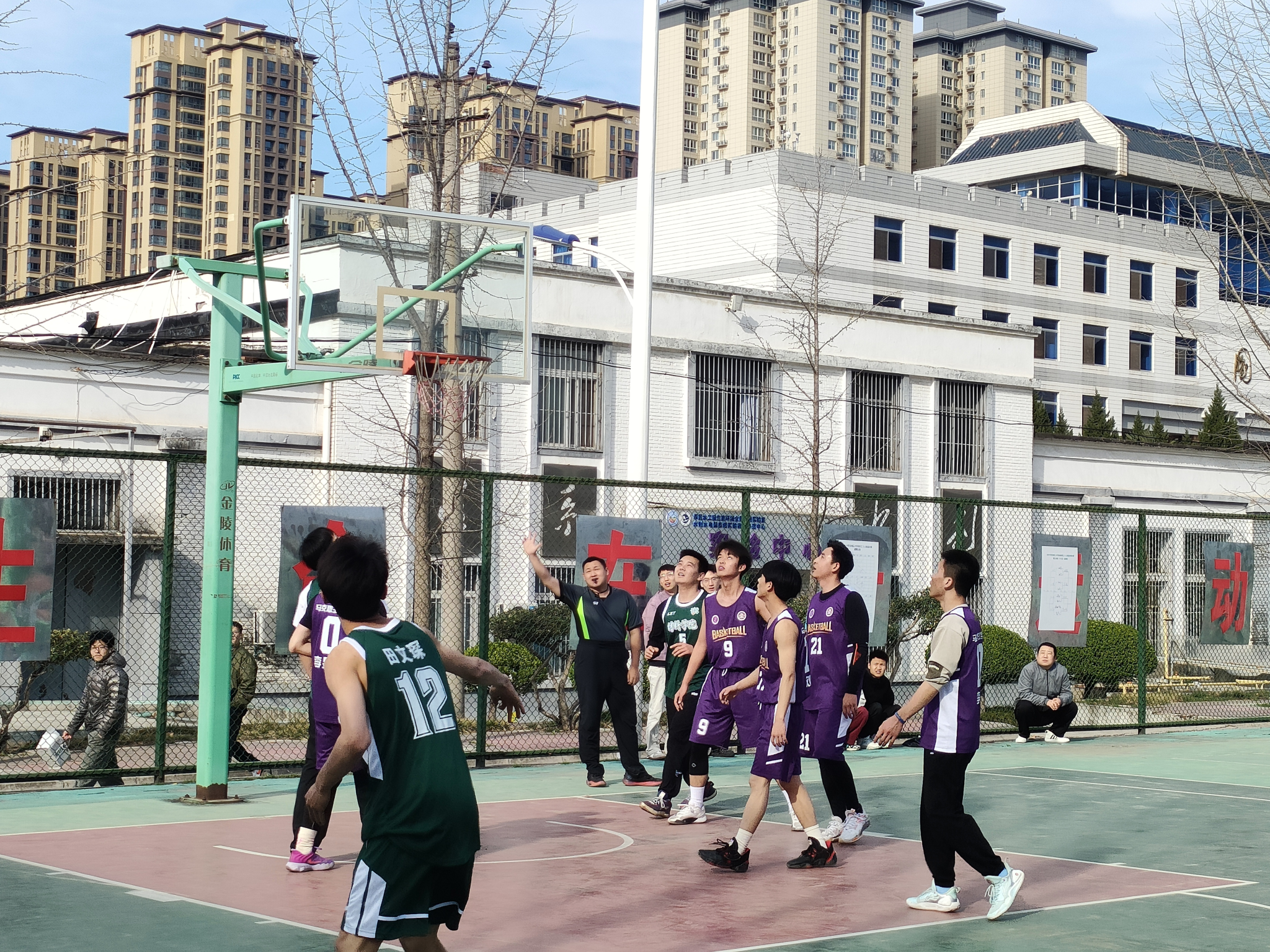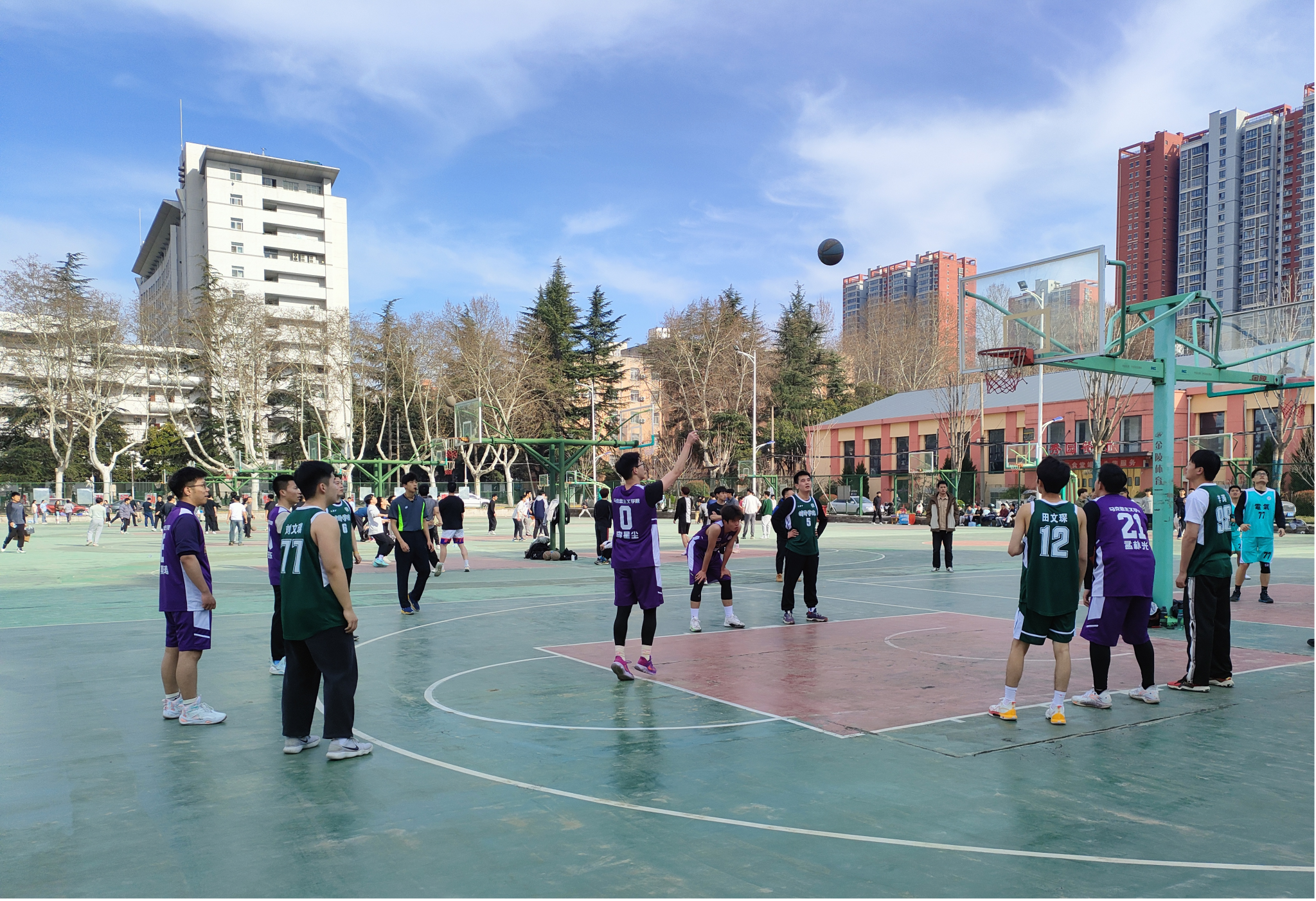 篮球赛场上,公司员工第一次参加校赛角逐,公司为队员统一购买队服,各位球员们也都精神饱满,全力以赴。带球,运球,投篮!他们潇洒的动作引起拉拉队员们的围观与喝彩!